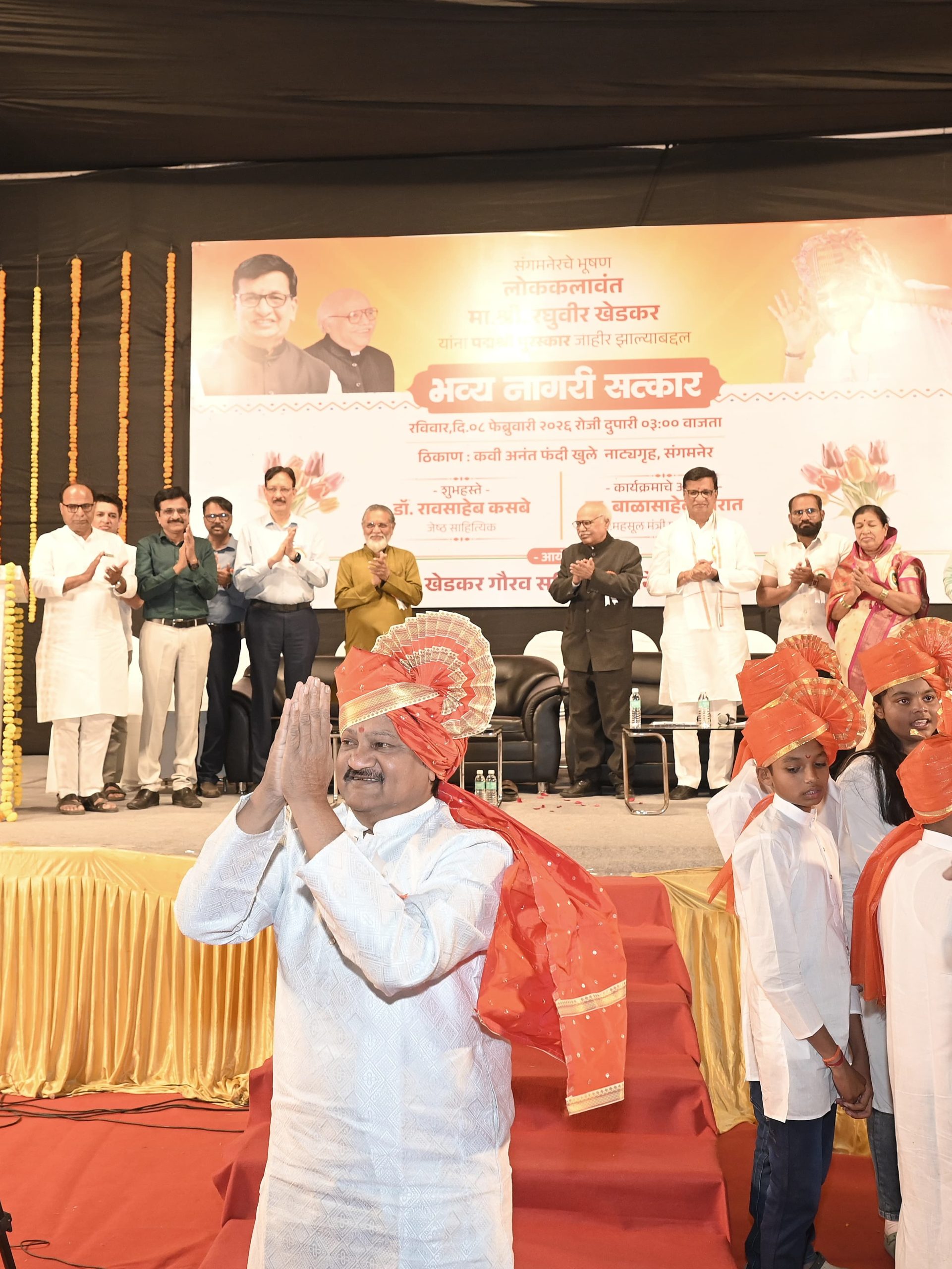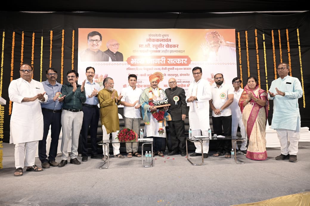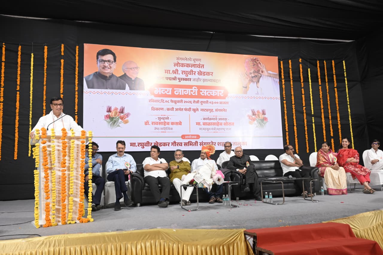 कवी अनंत फंदी खुले नाट्यगृह येथे संगमनेर मधील सर्वपक्षीय नागरिकांच्या वतीने पद्मश्री पुरस्कार मिळाल्याबद्दल लोक कलावंत रघुवीर खेडकर यांचा भव्य नागरिक सत्कार करण्यात आला यावेळी ते बोलत होते. यावेळी व्यासपीठावर ज्येष्ठ विचारवंत प्रा.डॉ.रावसाहेब कसबे, मा.आ. डॉ.सुधीर तांबे, आमदार सत्यजित तांबे, उद्योगपती राजेश मालपाणी, सौ.दुर्गाताई तांबे, डॉ. जयश्रीताई थोरात, नूर मोहम्मद शेख, प्रा.एस.झेड.देशमुख, डॉ.सोमनाथ मुटकुळे, डॉ.संजय दळवी, हिरालाल पगडाळ,नामदेव गुंजाळ यांच्यासह रघुवीर खेडकर यांचे कुटुंबीय व संगमनेर मधील विविध संस्थांचे पदाधिकारी उपस्थित होते.