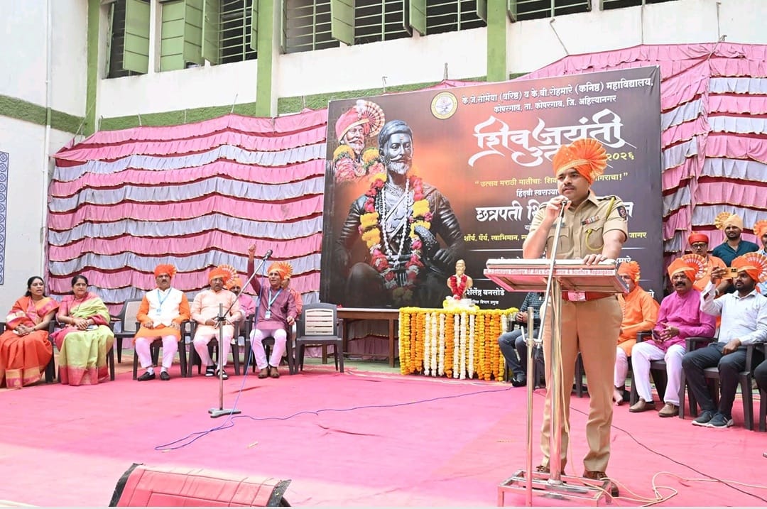 कोपरगाव । प्रतिनिधी । “देशाचेच नव्हे तर अखिल विश्वाचे आराध्य असलेल्या छत्रपती शिवाजी महाराजांच्या जयंती उत्सवा निमित्त आपण मला निमंत्रित केलेत याचा मला मनस्वी आनंद आहे. मी आज पर्यंत असा आगळावेगळा आणि पारंपरिक स्वरूपातील अप्रतिम कार्यक्रम प्रथमच अनुभवतो आहे. त्याबद्दल सर्वप्रथम मी या महाविद्यालयातील सर्व विद्यार्थी-विद्यार्थिनींना मनस्वी धन्यवाद देतो”, अशी प्रांजळ प्रतिक्रिया समारंभाचे प्रमुख अतिथी मा. अमोल भारती (उपविभागीय पोलीस अधिकारी शिर्डी अहिल्यानगर) यांनी येथे व्यक्त केली. स्थानिक के. जे. सोमैया वरिष्ठ व के. बी. रोहमारे कनिष्ठ महाविद्यालयाच्या सांस्कृतिक विभागाच्या वतीने आयोजित शिवजयंती उत्सवाच्या प्रसंगी श्री. भारती बोलत होते. अध्यक्षस्थानी प्राचार्य डॉ. विजय ठाणगे तसेच को.ता. एज्यु. सोसायटीचे सदस्य मा. सुरेश शिंदे, महाविद्यालय विकास समितीचे सदस्य मा. सुधीर डागा, मा. राजेश ठोळे, मा. सत्त्येन मुंदडा यांची प्रमुख उपस्थिती होती.