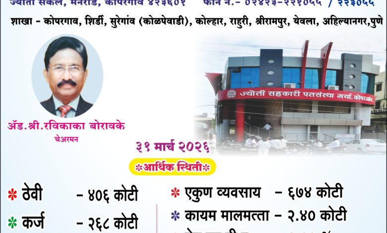 ज्योती सहकारी पतसंस्थेचा मार्च २०२६ अखेर ६७४ कोटींचा एकत्रीत व्यवसाय – अँड. रविकाका बोरावके