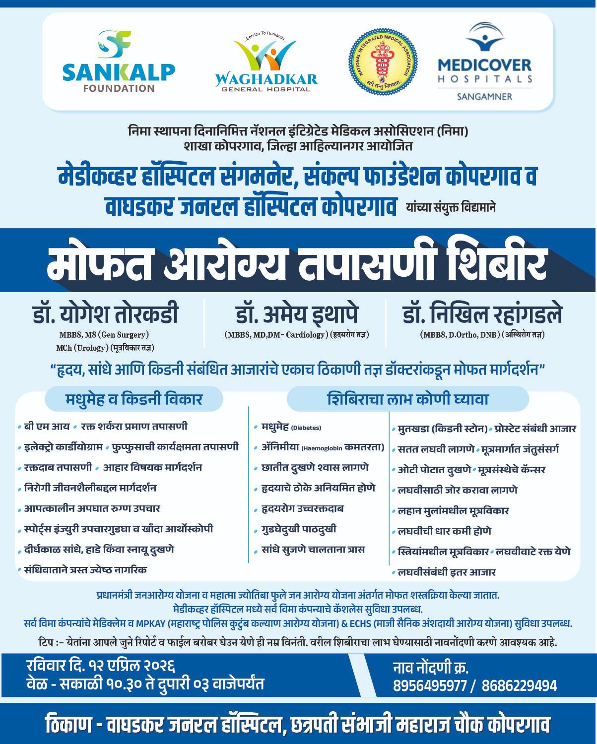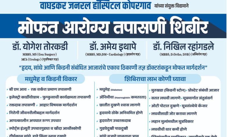 संकल्प फाउंडेशन, कोपरगाव, मेडिकव्हर हॉस्पिटल, संगमनेर तसेच वाघडकर जनरल हॉस्पिटल, कोपरगाव यांच्या संयुक्त विद्यमाने हा उपक्रम राबविण्यात येत आहे. या शिबिरामध्ये हृदयविकार, सांधेदुखी व हाडांचे आजार तसेच किडनी (मूत्रविकार) संबंधित आजारांवर मोफत तपासणी, उपचार व मार्गदर्शन करण्यात येणार आहे.या शिबिरासाठी तज्ञ डॉक्टरांची उपस्थिती लाभणार असून मूत्रविकार तज्ञ डॉ. योगेश तोरकडी, हृदयरोग तज्ञ डॉ. अमेय इथापे तसेच अस्थिरोग तज्ञ डॉ. निखिल रहांगडले हे रुग्णांची मोफत तपासणी करून आवश्यक ते मार्गदर्शन करणार आहेत.