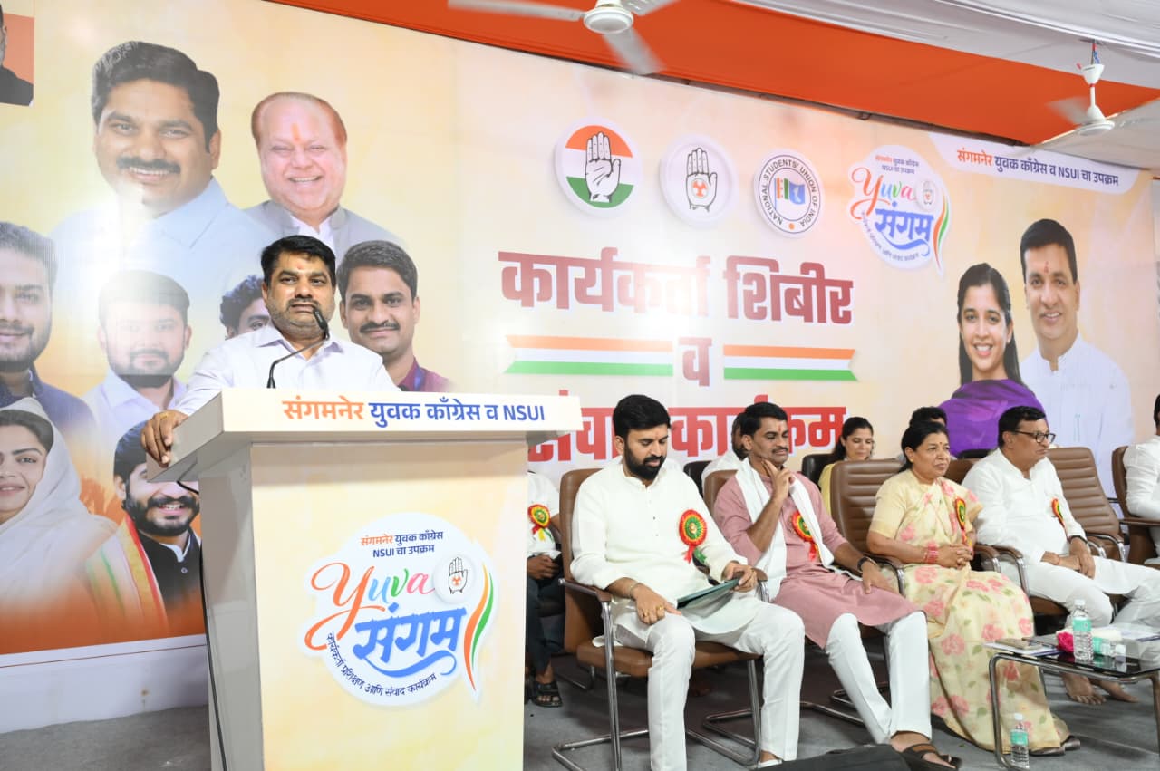 सहकारमहर्षी भाऊसाहेब थोरात सह.साखर कारखाना कार्यस्थळावर संगमनेर तालुका युवक काँग्रेस व एनएसयूआयच्या वतीने आयोजित युवा संगम कार्यकर्ता प्रशिक्षण आणि संवाद कार्यक्रमात ते बोलत होते. यावेळी अध्यक्षस्थानी काँग्रेसच्या राष्ट्रीय वर्किंग कमिटीचे सदस्य तथा मा.प्रदेशाध्यक्ष लोकनेते बाळासाहेब थोरात हे होते. तर व्यासपीठावर सौ.दुर्गाताई तांबे, ज्येष्ठ नेते माजी आमदार उल्हास दादा पवार, युवक काँग्रेसचे प्रदेशाध्यक्ष शिवराज मोरे,प्रवक्ते हनुमंत पवार, एनएसयुआयचे प्रदेशाध्यक्ष सागर साळुंखे, राज्य उपाध्यक्ष सय्यद आफरीन मुजफ्फर हुसेन, ऋषिकेश पाटील, बालाजी गाडे, संग्राम खोपडे, आयोजक तालुकाध्यक्ष डॉ.जयश्रीताई थोरात, गिरीजा पिचड, राहुल उगले,अजय फटांगरे, सोमेश्वर दिवटे,निखिल पापडेजा, शेखर सोसे, सुभाष सांगळे आदींसह युवक काँग्रेसचे विविध पदाधिकारी मोठ्या संख्येने उपस्थित होते.