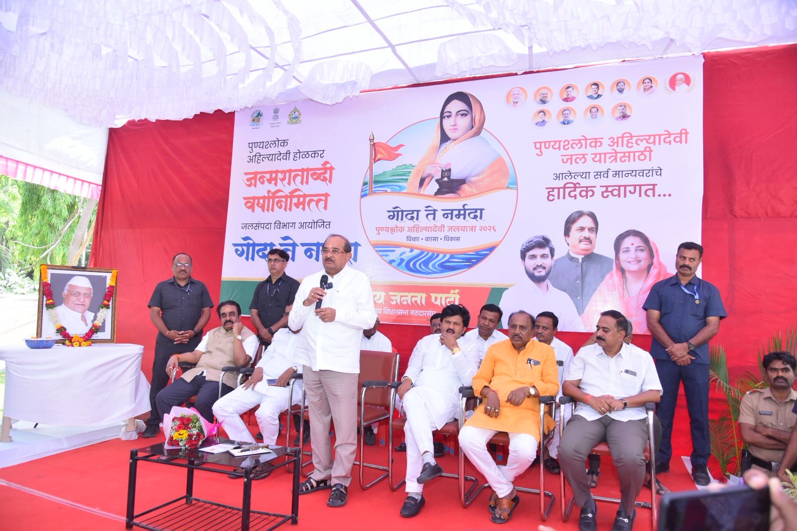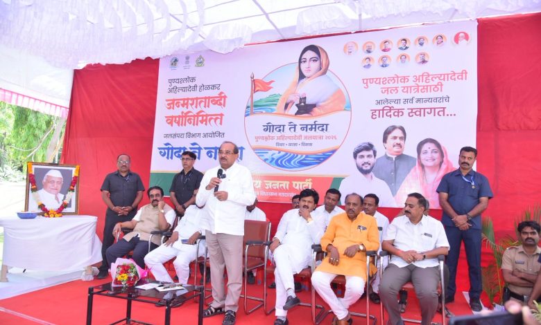 पुण्यश्लोक अहिल्यादेवी होळकर यांच्या जन्मदिनाच्या त्रिशताब्दी वर्षाचे औचित्य साधून काढण्यात आलेल्या ‘गोदा ते नर्मदा’ जलयात्रेचे स्वागत कोपरगाव येथे आ. आशुतोष काळे यांच्या वतीने करण्यात आले. याप्रसंगी बोलताना मंत्री विखे पाटील म्हणाले की, “यापूर्वी वर्षानुवर्षे जलप्रकल्पांची कामे होऊ शकली नव्हती, अनेकांनी फक्त आश्वासने दिली. निळवंडे सारखा महत्त्वाकांक्षी प्रकल्प पूर्ण करण्यासाठी राज्यात महायुतीचे सरकार यावे लागले. कालवे पूर्ण झाले, म्हणूनच या भागात पाणी येऊ शकले. आता अधिकचे काम करून उर्वरित गावांनाही पाणी देण्याचे त्यांनी आश्वासित केले.” संजीवनी उद्योग समूहाच्या वतीने आयोजित कार्यक्रमात बोलताना आ. गोपीचंद पडळकर म्हणाले की, “पुण्यश्लोक अहिल्यादेवी होळकर यांचे जलसंवर्धनाचे कार्य खूप मोठे होते. त्यांच्या कार्याचा आदर्श डोळ्यासमोर ठेवूनच महायुती सरकार काम करीत आहे.” यावेळी मंत्री विखे पाटील यांनी माहिती दिली की, “गोदावरी खोऱ्यात ७८ टीएमसी पाणी आणण्याचे उद्दिष्ट हाती घेतले आहे. मुख्यमंत्री देवेंद्र फडणवीस यांनी निधीची उपलब्धता करून दिली असल्याने, लवकरच निविदा प्रक्रिया पूर्ण करून हे काम प्राधान्याने पूर्ण करण्याचा आमचा प्रयत्न आहे.”